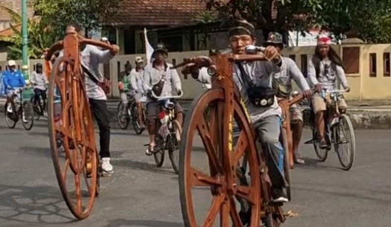 Jepara – Dalam gelaran Ngonthel Bumi Kartini ke 2 di Pantai Kartini Jepara ada salah satu kontingen yang membawa sepeda unik. SepedSeped0 berbahan dominal kayu jati dan nangka ini milik mas Tularno yang akrab di pangggi Pusak . Ke Jepara Mas Pusak membawa 4 sepeda kayu koleksinya.